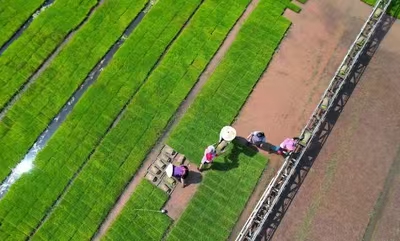 谷雨至,正是插秧好时节。4月18日,内江市东兴区石子镇宏展粮油专业合作社集中育秧基地,农民正在抢抓农时起运早稻秧苗,及时保障种粮大户的订单需求,为适时插秧和水稻丰产丰收打下基础。兰自涛摄