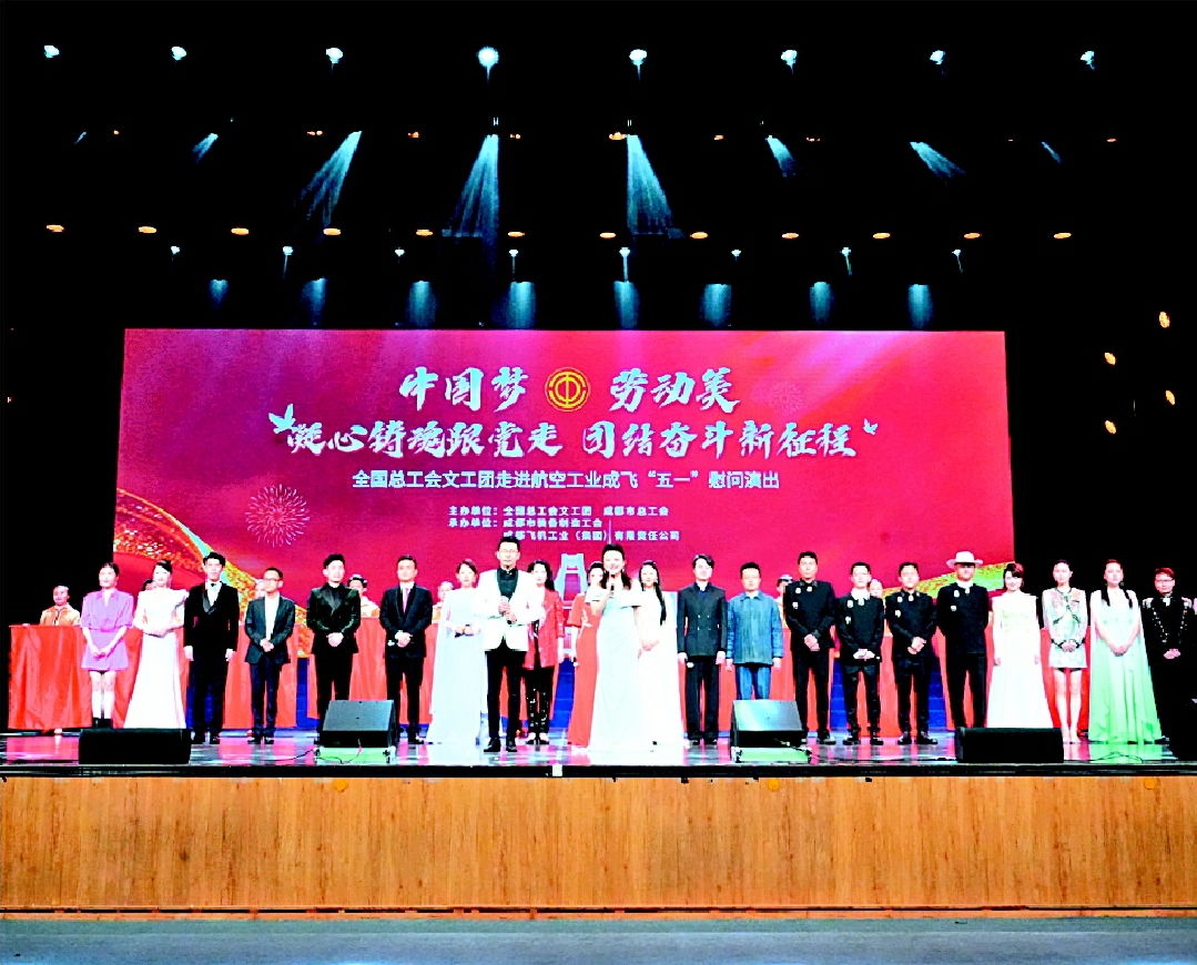 本报讯 (记者张杨文/图)4月22日,“中国梦·劳动美---凝心铸魂跟党走团结奋斗新征程”全国总工会文工团走进航空工业成飞“五一”慰问演出,在成飞体育馆拉开帷幕。成飞劳模工匠、先进工作者、一线职工代表等近千名观众欢聚一堂,共享文艺盛宴。