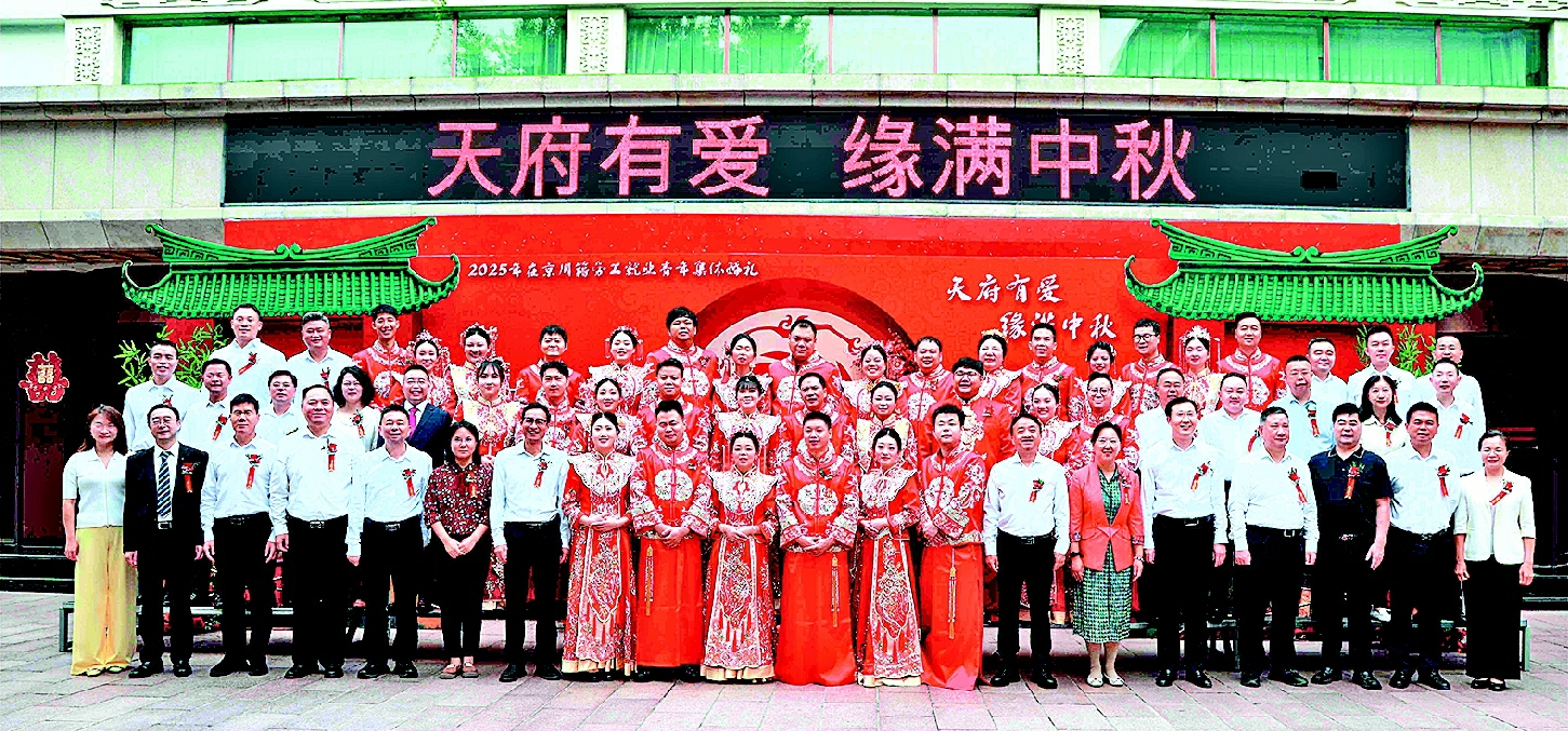 天府有爱,缘满中秋。9月27日上午,北京天府蜀风酒店内张灯结彩、笑语盈盈,一场属于平凡劳动者的浪漫仪式正在温暖上演---来自基层一线的16对川籍在京务工就业青年,在中秋佳节来临之际携手走上红毯,以一场传统而庄重的中式集体婚礼,共同开启人生的崭新篇章。
