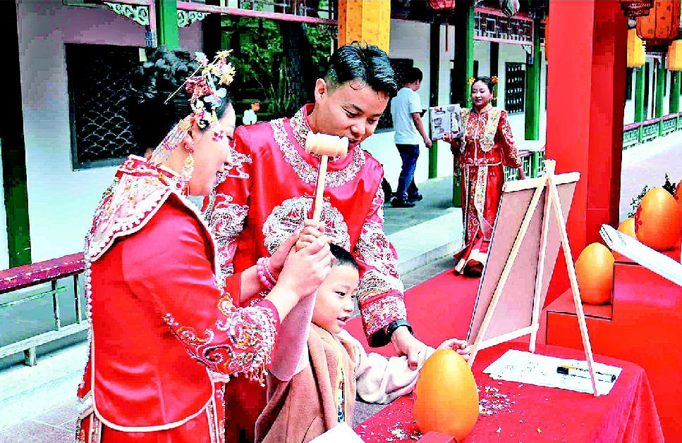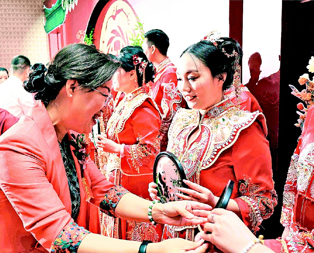 良辰已至,鸾凤和鸣。红毯铺喜,华灯映彩。在悠扬的礼乐声中,新人们身着传统婚服,依古礼缓缓步入礼堂,每一步都踏出庄重与期待。却扇礼中,一扇一放,寓意辞旧启新、举案齐眉;结发为盟,青丝互绾,许下“结发同心”的誓言;合卺交杯,共饮醴酒,象征今后风雨同舟、甘苦与共。整场婚典融东方美学与婚俗古意为一体,简约而不失温情,传统亦洋溢时尚,掌声与祝福始终萦绕在整个大厅。