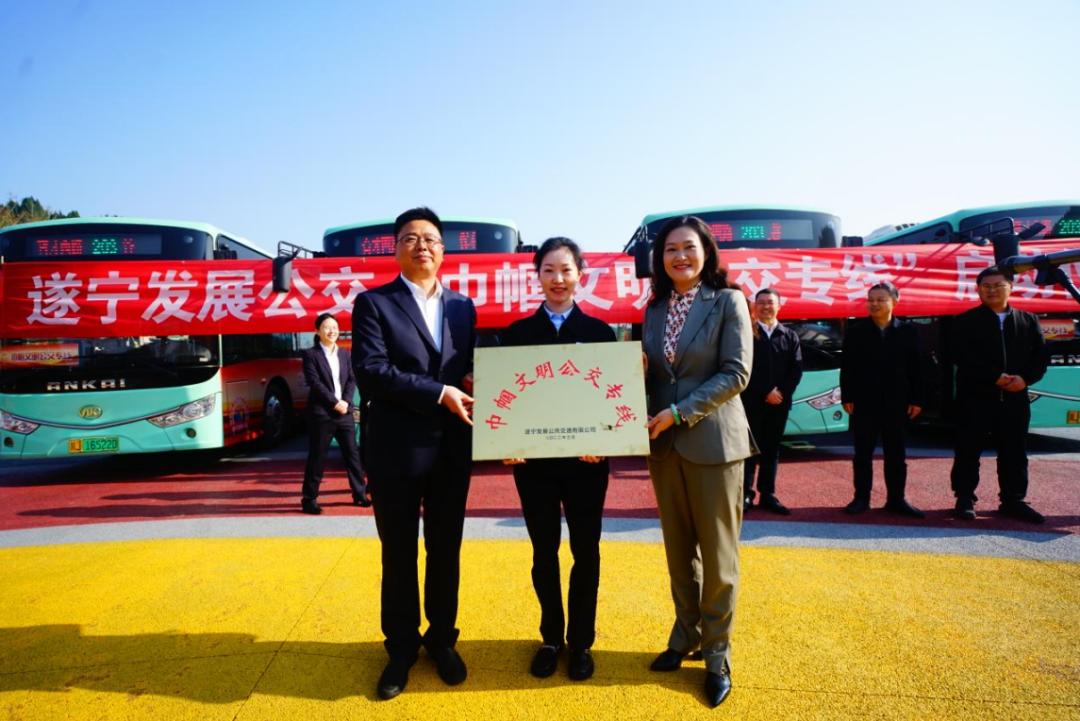 丁小艳(中)在遂宁巾帼文明公交专线授牌仪式现场