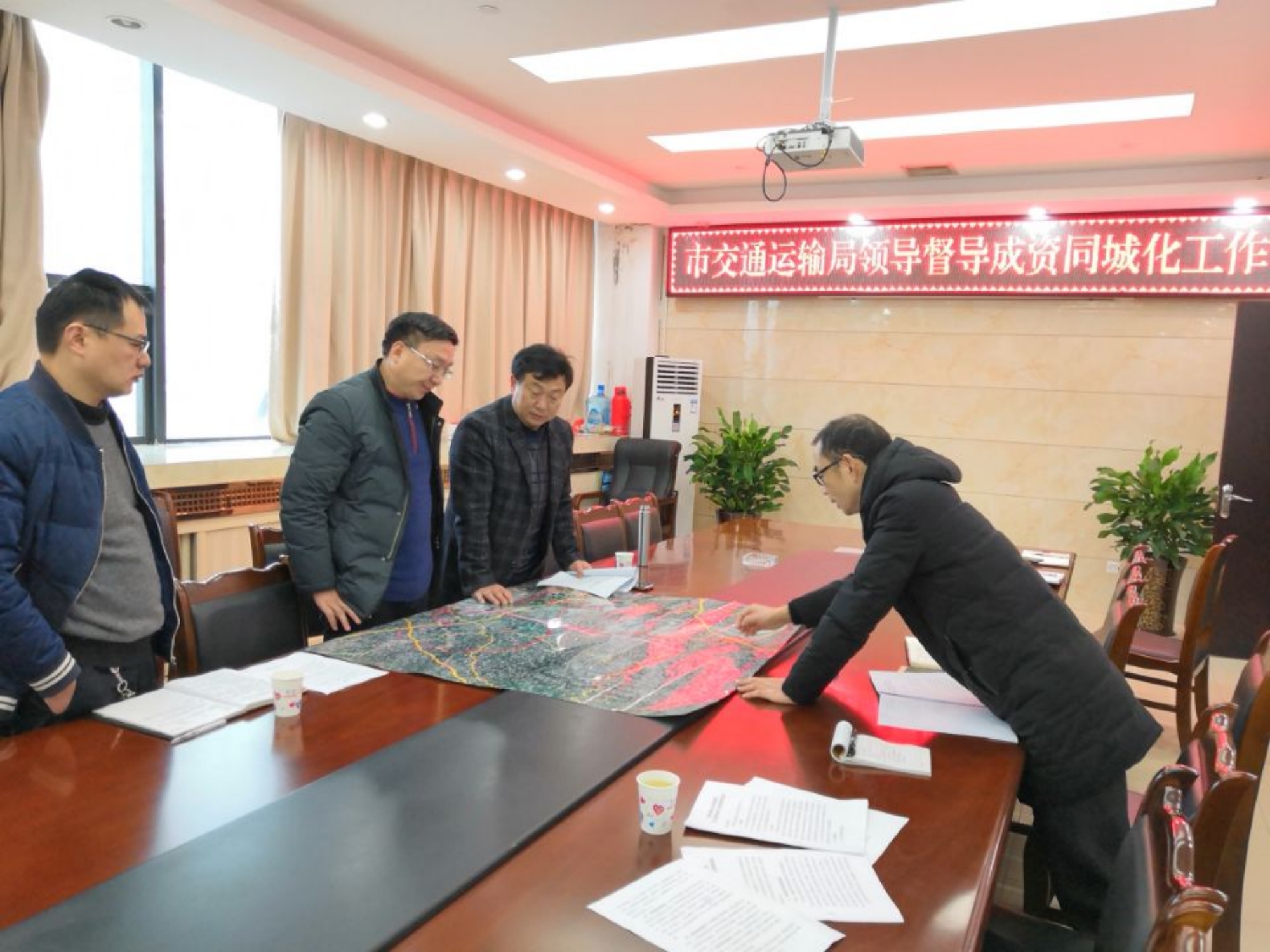 杨刚(右)向市交通运输局领导汇报成资同城化交通情况