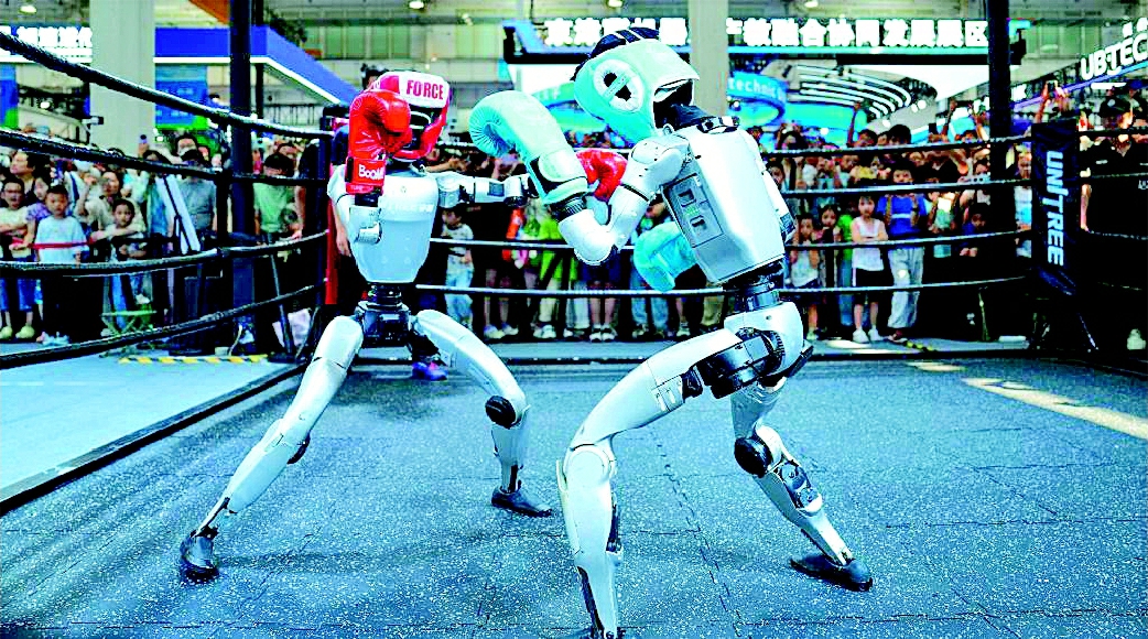 在2025世界机器人大会展馆内,观众在宇树机器人展台观看机器人拳击展示 新华社记者鞠焕宗摄