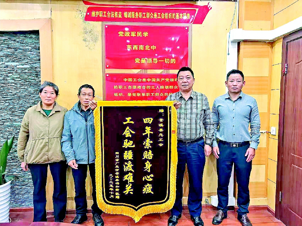 10月14日10时许,广元市苍溪县总工会办公室里十分热闹,这里来了一对农民工夫妇,他们将一面写着“四年索赔身心疲 工会驰疆渡难关”的锦旗亲手送到苍溪县总工会党组成员、副主席李洪宝的手中,以此感谢县总工会为其讨回拖欠了四年之久的工伤赔偿款。
