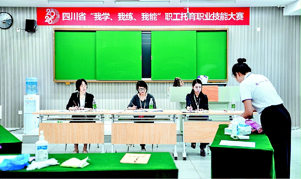今年的四川省“我学、我练、我能”职工托育职业技能大赛更是亮点纷呈,进一步深化“以赛促学、以赛促训、以赛促评、以赛促建”的初衷,推动托育服务行业整体水平提升。大赛裁判长、四川大学华西第二医院副院长肖雪感慨道:“今年选手整体水平较去年明显提升,在基础知识竞赛机考中,选手的答题速度、题目理解度均有较大进步;实操环节里,沟通表达、动作娴熟度及服务意识也显著提高。”这背后,是选手经过多次集中培训、积累比赛经验后的厚积薄发。