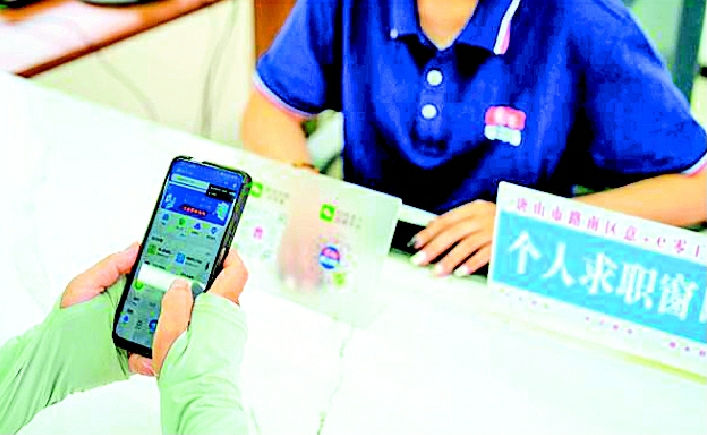2023年7月2日,求职者在河北省唐山市路南区初心家园零工市场服务站,通过扫描二维码获取招聘信息。 新华社记者牟宇摄