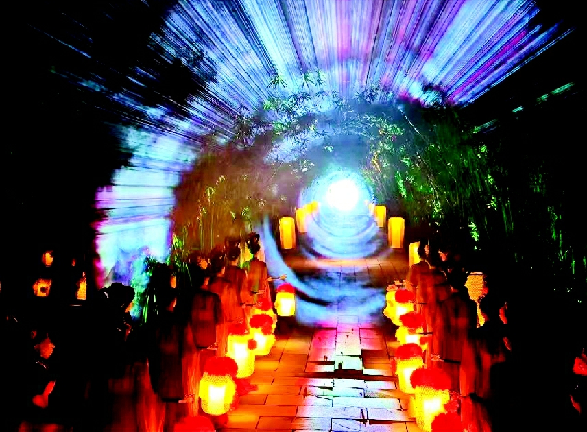 此刻的翠竹长廊光影交织,宛若一条“时空隧道”,提着灯笼,穿过长廊,便“穿越”到了1200年前的盛唐。故事的主人公薛涛就此登场,带你见证她生命里无数的精彩瞬间。