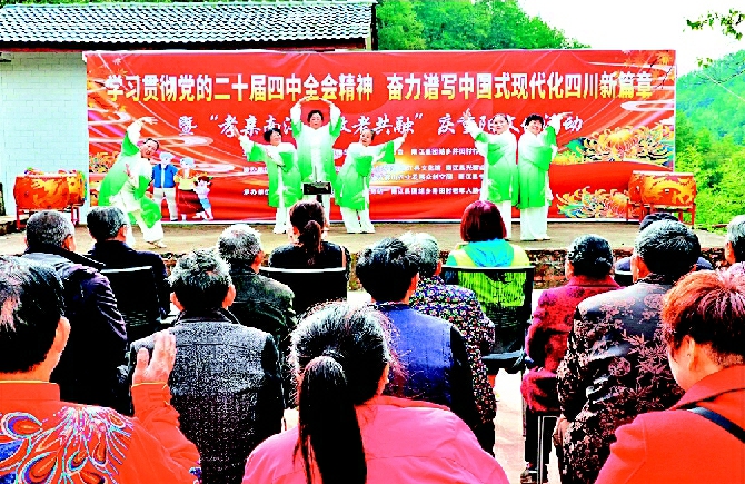 活动伊始,村里男女老少齐聚一堂,共同学习了党的二十届四中全会精神,将国家大政方针与乡村发展、老年福祉紧密联系,让大家凝聚起共建美好家园的共识。随后,来自南江县义工协会、爱尚舞蹈队、星耀太极队等文艺志愿者带来的歌舞、太极拳、太极扇和民俗展演等文艺节目轮番上演,台上台下笑声不断,在欢乐和互动中传承敬老爱老美德。