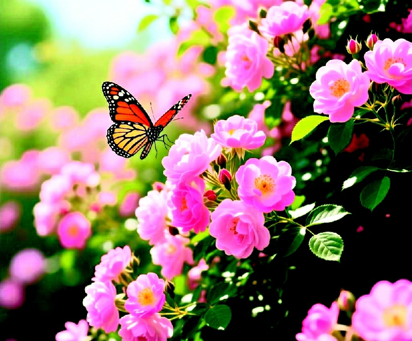 傍晚,我踩着被落日染成蜜色的石径回家。经过一片开得正艳的粉蔷薇,忽然看见一只蝴蝶,像从时间的缝隙里跌出来,轻轻擦过我的眉梢,又悠悠地飞进花影深处,独自翩跹起舞。