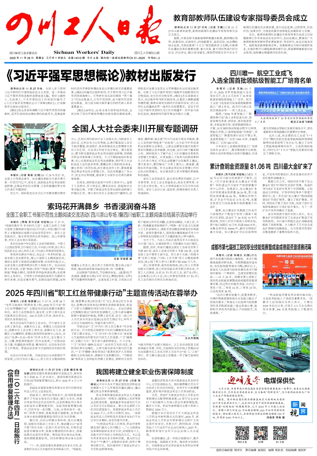 《习近平强军思想概论》教材出版发行教育部教师队伍建设专家指导委员会成立全国人大社会委来川开展专题调研索玛花开满彝乡 书香浸润奋斗路2025年四川省“职工红丝带健康行动…四川唯一 航空工业成飞入选全国首批领…累计查明金资源量81.06吨 四川最…成都市第七届技工院校职业技能竞赛暨成…《信用修复管理办法》自二O二六年四月…我国将建立健全职业伤害保障制度迎峰度冬 电煤保供忙